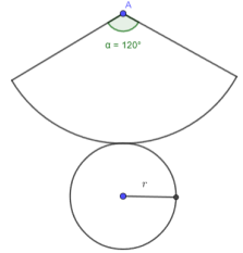 $\begin{array}{rcl} \alpha&=&\dfrac{r\times 360^{\circ}}{g}\\\Longrightarrow 120^{\circ}&=&\dfrac{r\times 360^{\circ}}{g}\\\Longrightarrow 120\,g&=&r\times360\\\Longrightarrow\,g&=&3r\\\text{Par ailleurs, on a : }g^{2}&=&h^{2}+r^{2}\\\Longrightarrow\,h&=&\sqrt{g^{2}-r^{2}}\\&=&\sqrt{9r^{2}-r^{2}}\\&=&\sqrt{8r^{2}}\\&=&2\sqrt{2r}\\\text{D'où : }V&=&\dfrac{\pi r^{2}h}{3}\\&=&\boxed{\dfrac{2\sqrt{2\pi r^{3}}}{3}} \end{array}$