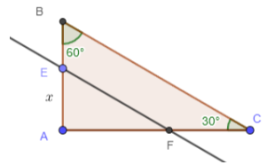 $\begin{array}{rcl} \cos 60^{\circ}&=&\dfrac{AB}{BC}\\\Longrightarrow AB&=&BC\times\cos60^{\circ}\\&=&BC\times\dfrac{1}{2}\\&=&10\times\dfrac{1}{2}\\&=&5\\ \text{PAR THALES, }\dfrac{x}{AB}&=&\dfrac{EF}{BC}\\\Longrightarrow\,EF&=&\dfrac{BC}{AB}x\\&=&\boxed{2x} \end{array}$