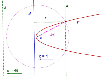 Le lieu géométrique $\Gamma$ des poins $P$ du plan qui vérifient l'équation $PF=\varepsilon\cdot Pd$ est appelé conique de foyer $F$, de directrice $d$ et d'excentricité $\varepsilon$