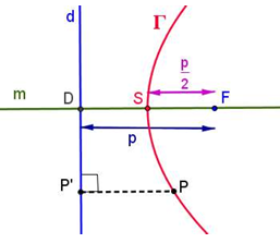 Soit $\Gamma$ une parabole $(\varepsilon=1)$ de foyer $F$, de directrice $d$, d'axe focal $m(m\cap d=\left\lbrace D\right\rbrace)$ et de somme $S$