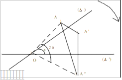$(\Delta)$ et $\left(\Delta'\right)$ étant deux droites sécantes en $0$ formant un angle de mesure a, faire la symétrie orthogonale par rapport à $(\Delta)$ suivie de la symétrie orthogonale par rapport à $\left(\Delta'\right)$ revient à faire la rotation de centre $0$ et d'angle de mesure $2a$